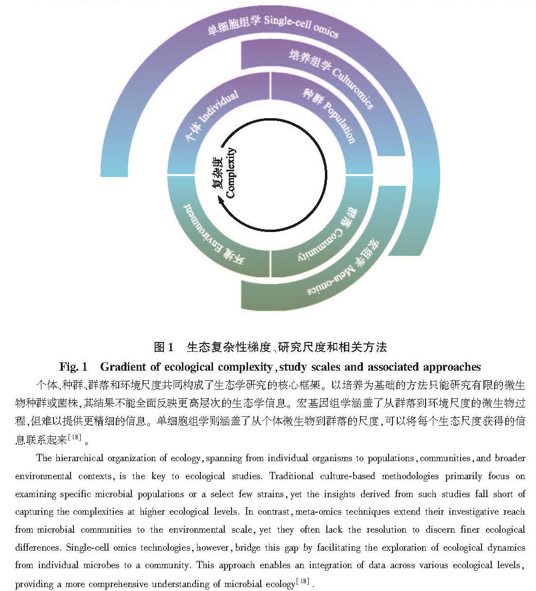 在生态系统中,生物与生物之间以及生物与环境之间的相互作用发生在从分子到群落以及物种内部或物种之间等多个生态尺度上,并受到各种生物及非生物因素的影响。为了全面理解生态和进化过程,需要从不同生态尺度和角度出发,获取更加详尽的信息[1]。微生物个体(细胞)作为研究环境微生物的基本单位[2-3],是连接生态系统、群落和种群的纽带。在微生物代谢过程中,基因组和代谢途径的微小变化会改变微生物互作关系以及微生物群落构建过程,从而对生态系统产生重大影响。因此,研究大尺度上的生态机制需要关注微生物个体的作用过程,这也是当今环境微生物研究所面临的挑战之一[4]。
